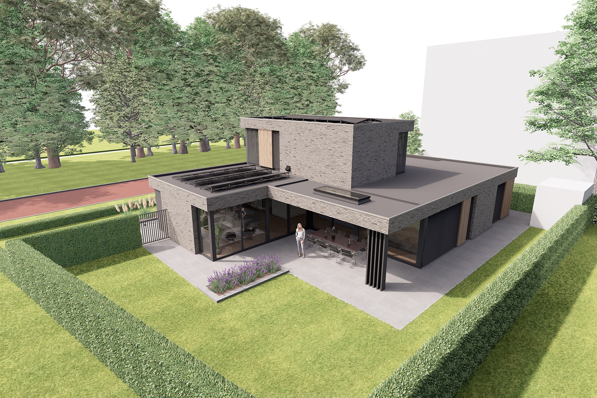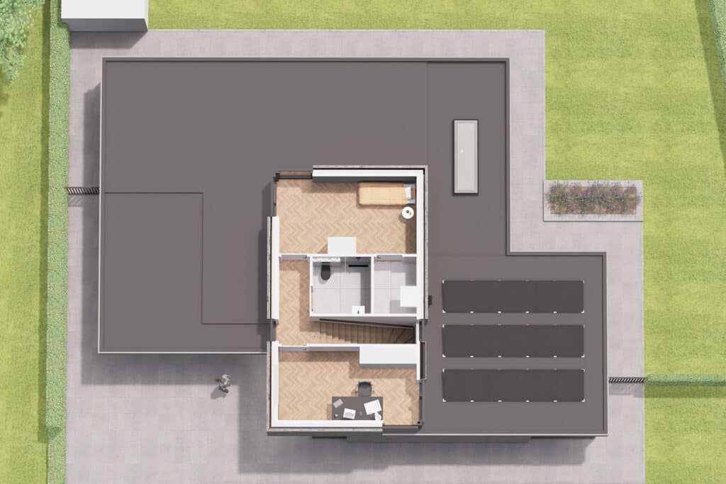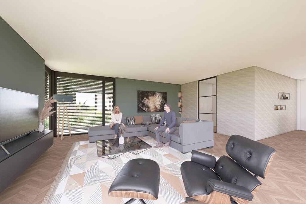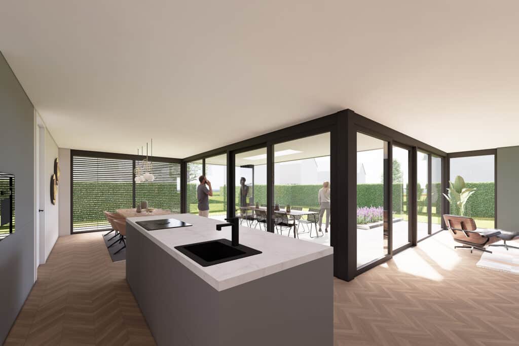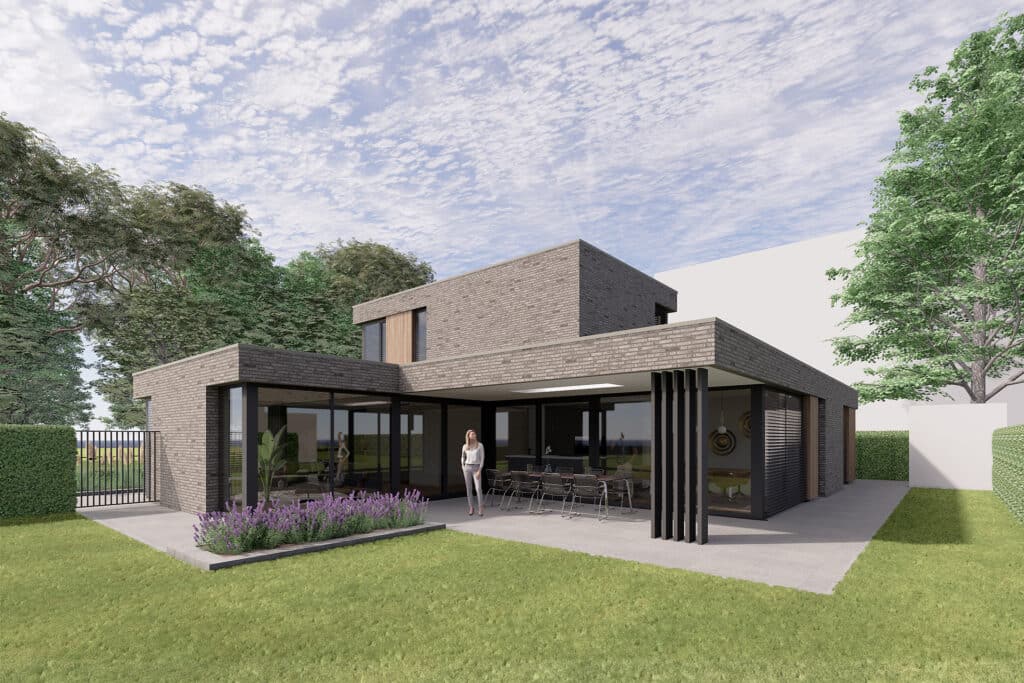 Deze vrijstaande semibungalow wordt gerealiseerd op een bijzondere locatie op een hoekkavel aan het begin van het plan en ligt op steenworp afstand van het bosgebied Loonse en Drunense Duinen. Het betreft hier een levensloopbestendige woning met een volledig woonprogramma op de begane grond. De kozijnen zijn overhoeks geplaatst om zo het uitzicht te optimaliseren. Tevens maakt het de statige woning lichtvoetig. In het ontwerp is gekozen voor bruin, grijze keramische gevelstenen. Door gebruik te maken van naturel gevelplanken zorgt het voor een harmonieus geheel.