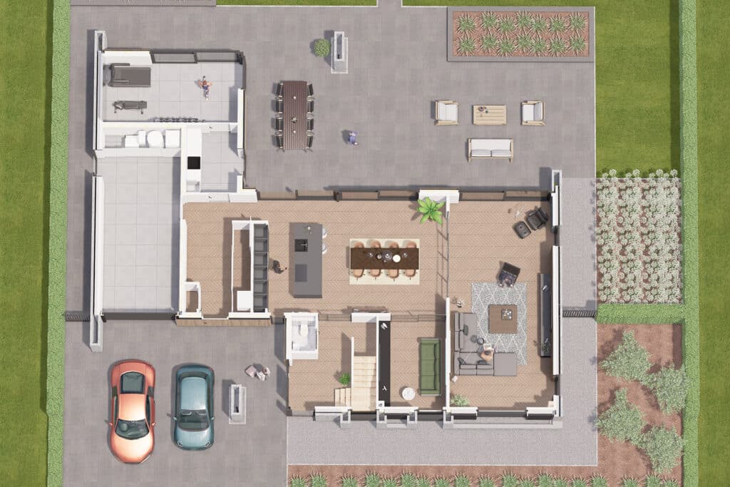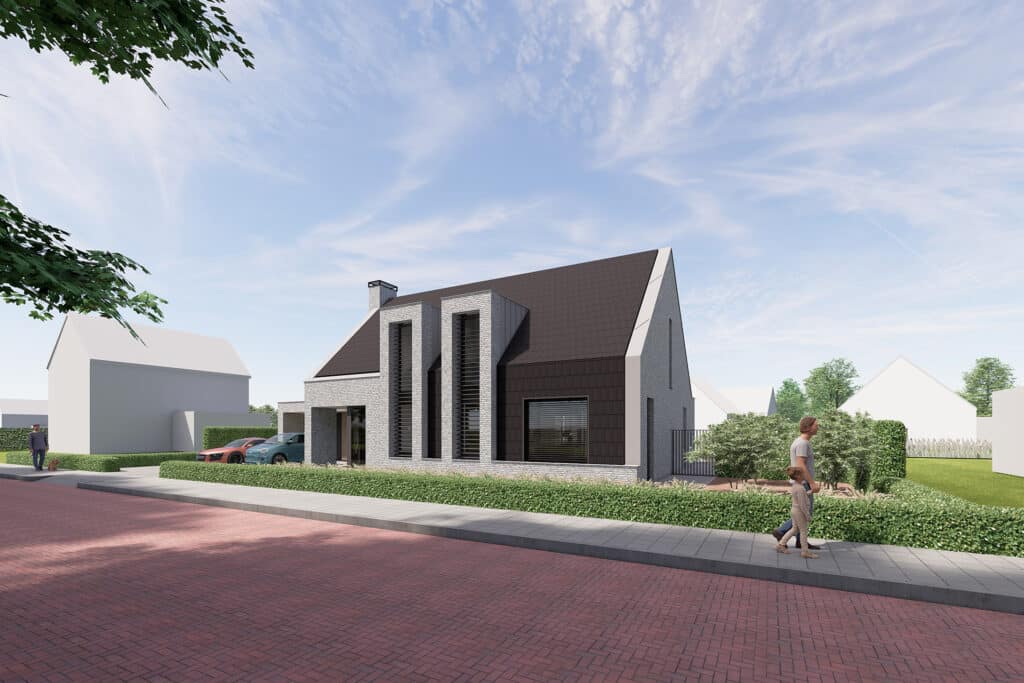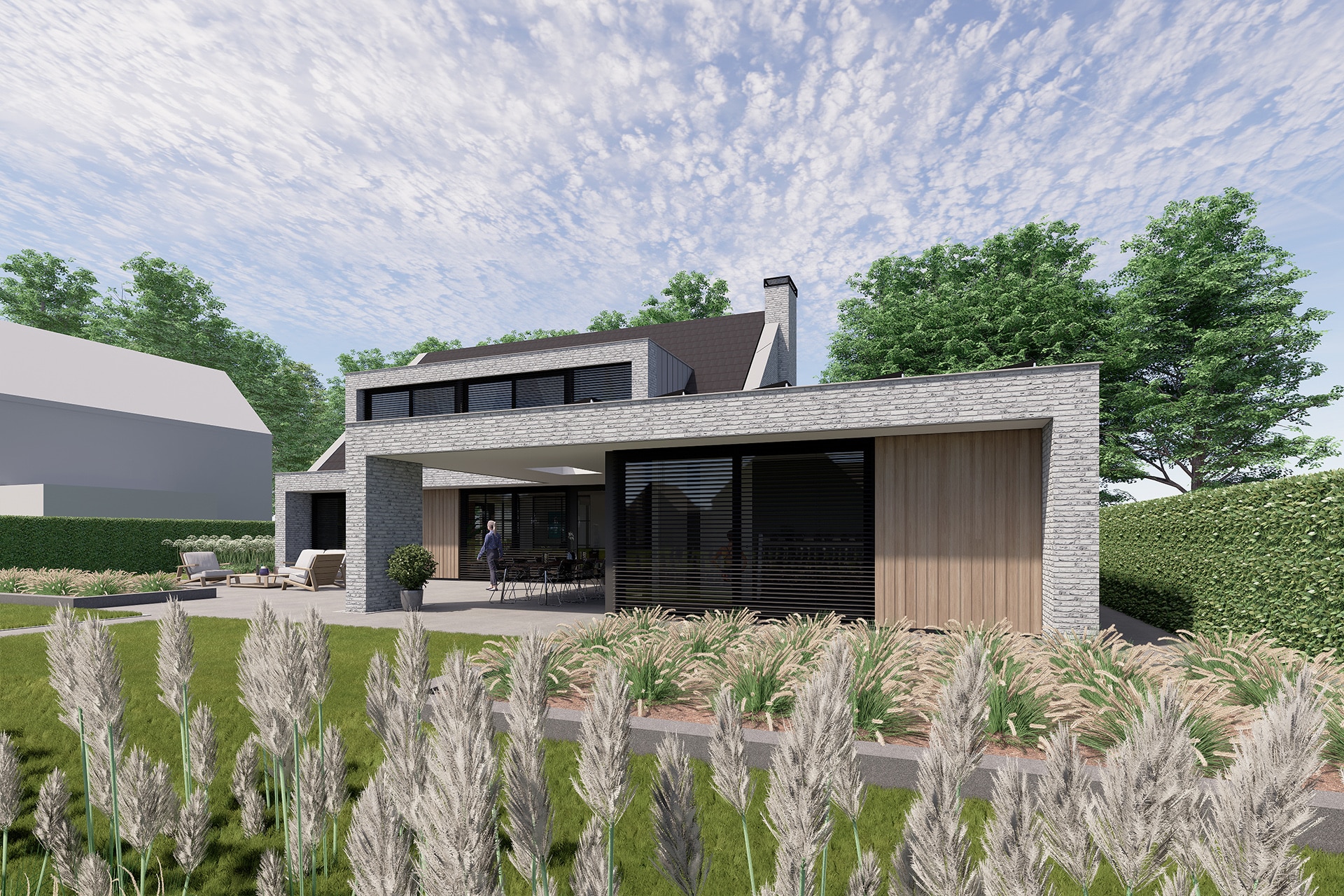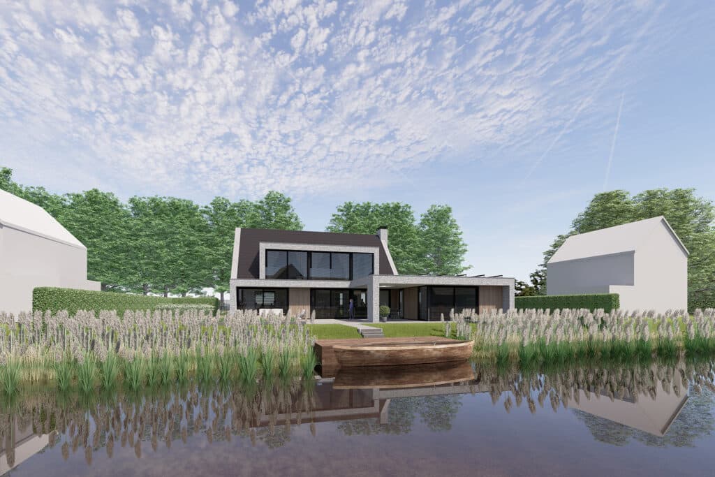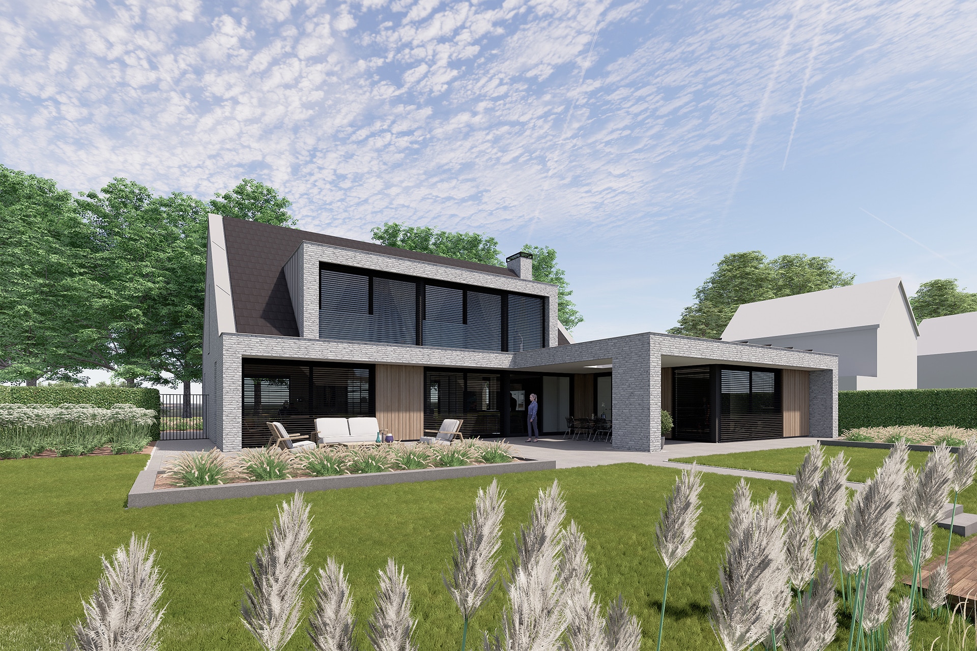 Deze vrijstaande woning wordt binnen het nieuwbouwplan Akkerlanen in Waalwijk gerealiseerd. Het betreft een breed kavel dat parallel aan de Akkerlaan is gelegen. Aan de achterzijde grenst de woning fraai aan het water. De woning is in de breedte gesitueerd om zo een optimale oriëntatie op het water en de tuin te hebben. Ook op de verdieping hebben de slaapkamers zicht over het water. Vanuit het beeldkwaliteitsplan is o.a. een schuin dak, lichte gevelsteen en metselwerk als drager van het ontwerp voorgeschreven. Ondanks dat het metselwerk als drager van ontwerp moet zijn opgenomen is het niet de bedoeling een sober massief gebouw te maken. Het metselwerk loopt dan ook dynamisch vanuit het hoofdvolume over in de laagbouw. Door het dak aan de voorzijde door de gootlijn richting maaiveld te laten doorlopen ontstaat er een minder massief geheel. Tevens is het metselwerk doorgezet in de opbouw aan de achterzijde en de twee risalieten in de voorgevel. De prominente gemetselde risalieten zorgen voor een statige entree aan de binnenzijde en bieden ruimte en licht aan de speelkamer en badkamer op de verdieping. Tenslotte geven ze de woning ook een duidelijke karakteristiek.