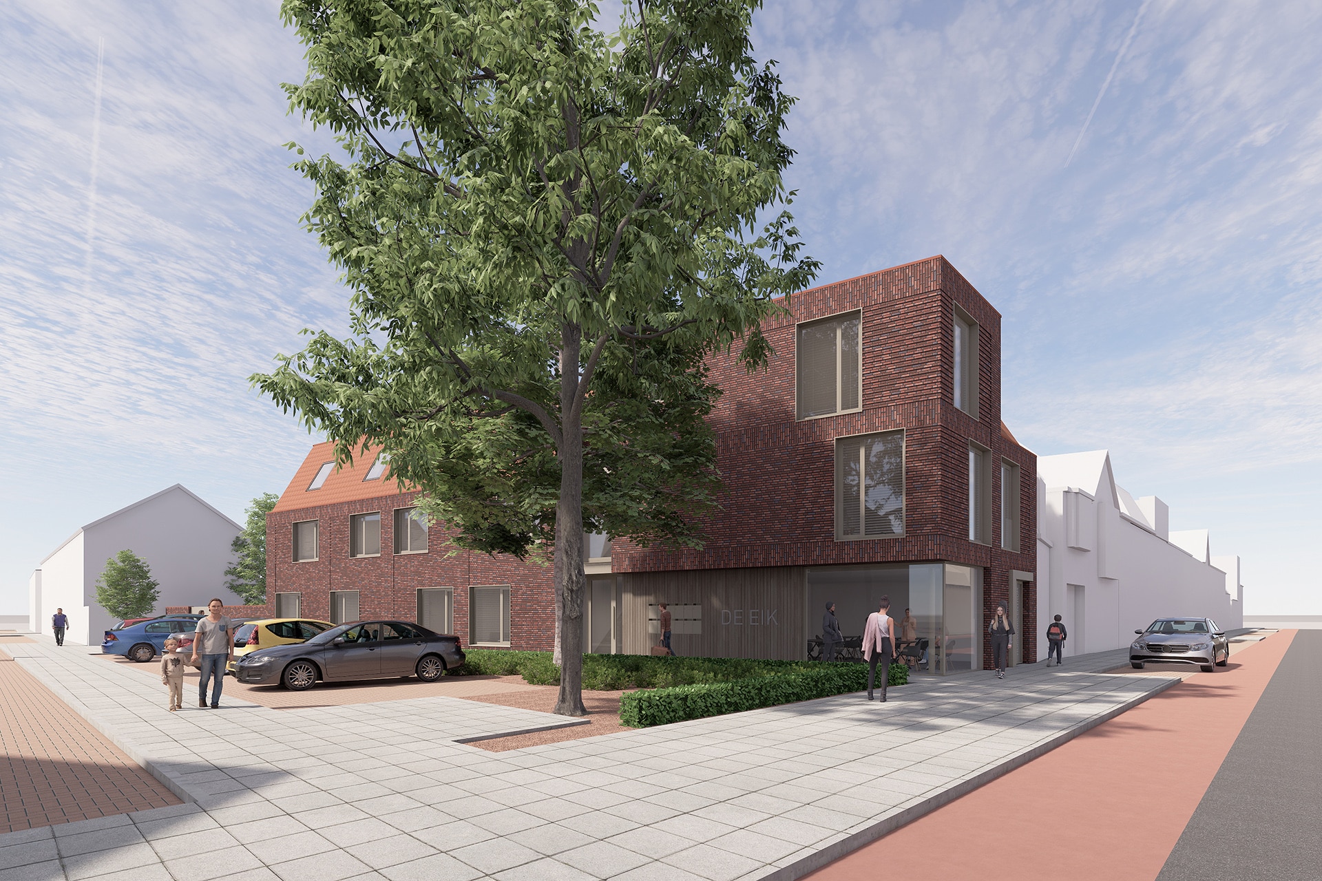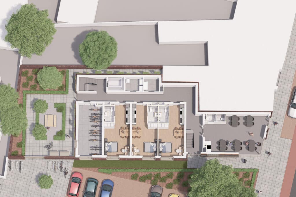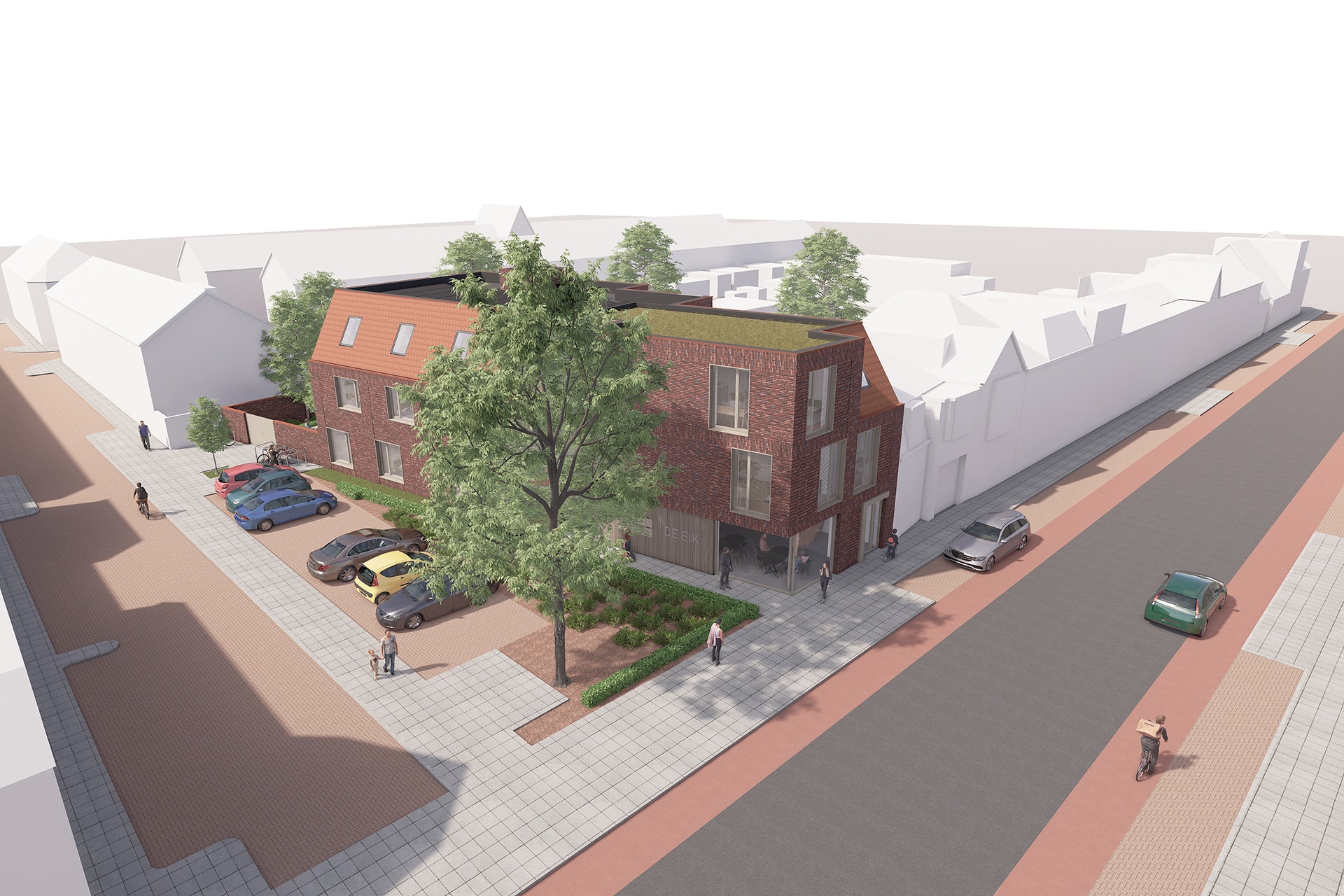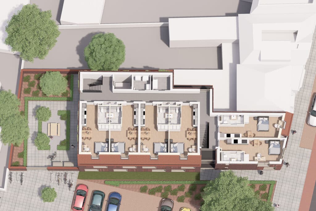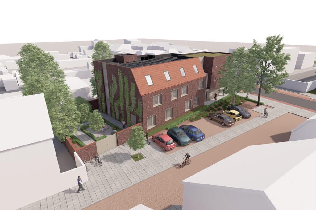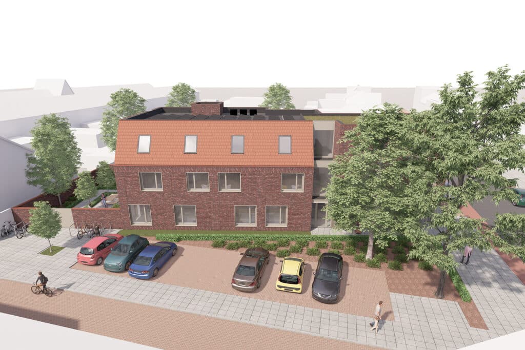 Gelegen op de hoek van de Bredaseweg en de Eikstraat in Tilburg hebben wij een plan gemaakt voor een 15-tal studentenwoningen. Dit is buiten het centrum, maar nog binnen de ring. Het is een bijzondere zicht locatie die een overgang is van de karakteristieke Lintbebouwing aan de Bredaseweg naar de woonwijk genaamd de Noordhoek. De twee aanwezige bomen met een groenperk markeren duidelijk deze hoek.
