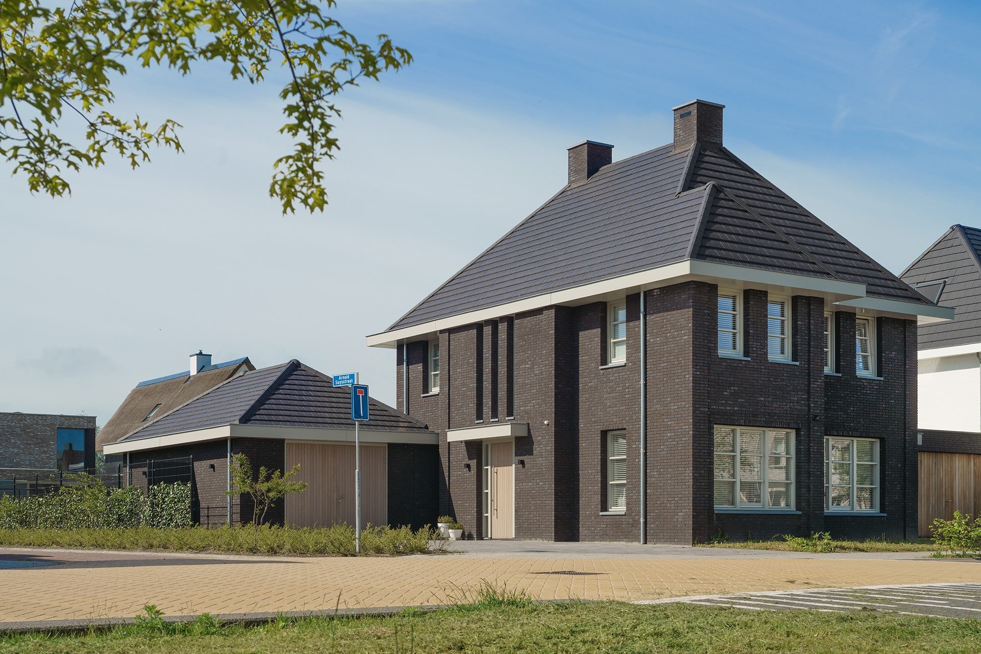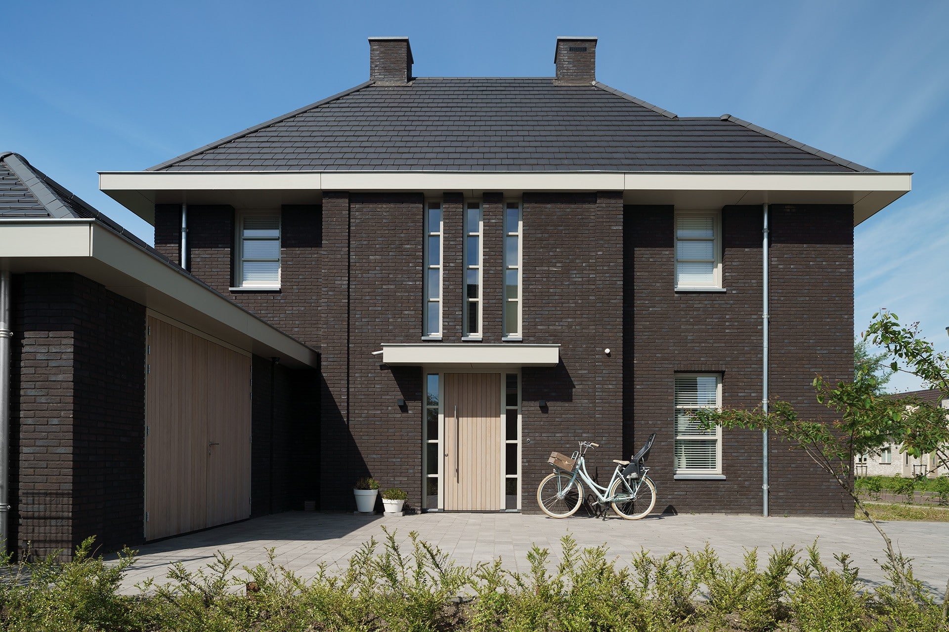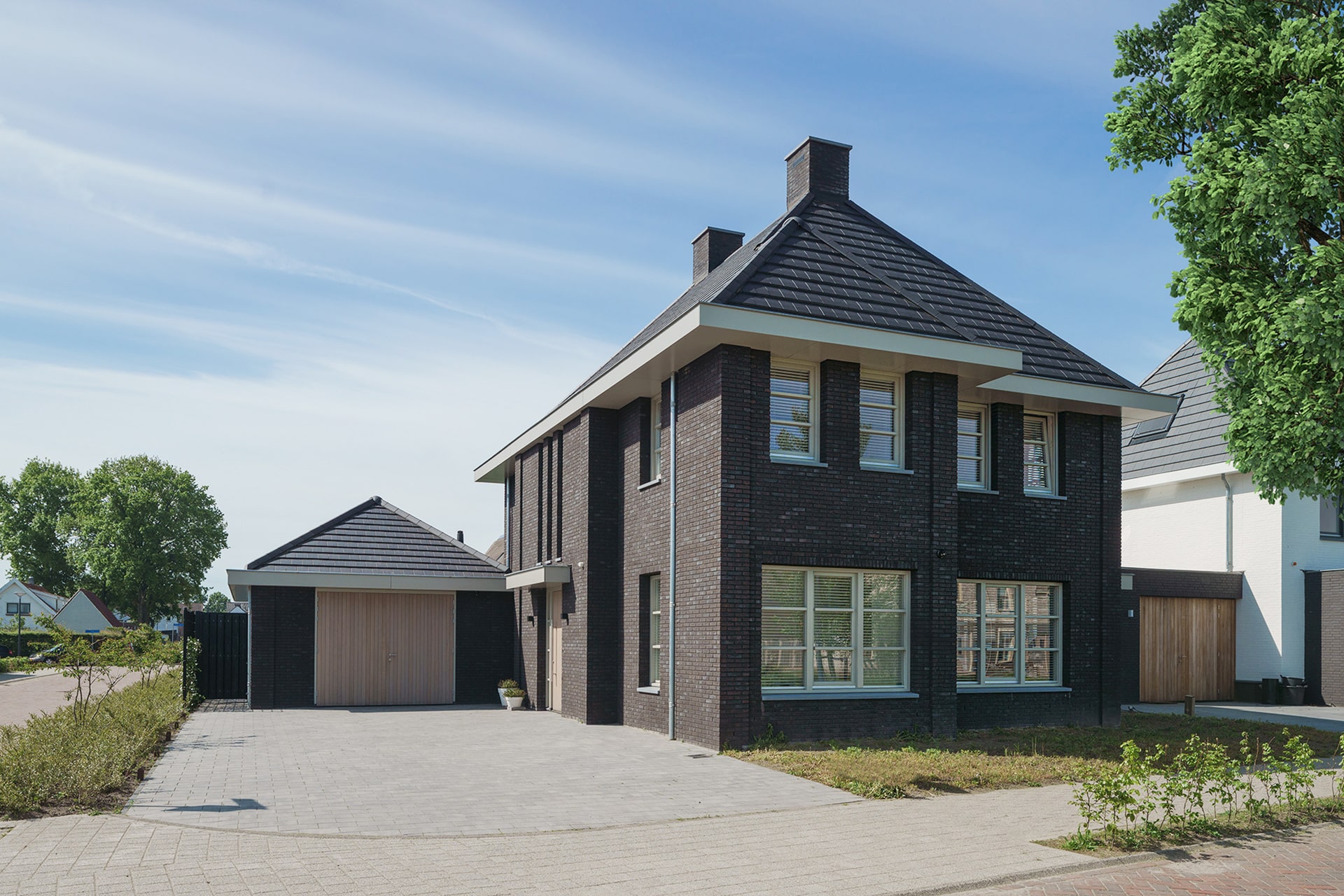 De donkere steen in combinatie met de lichte kozijnen en goten geven de woning een unieke uitstraling