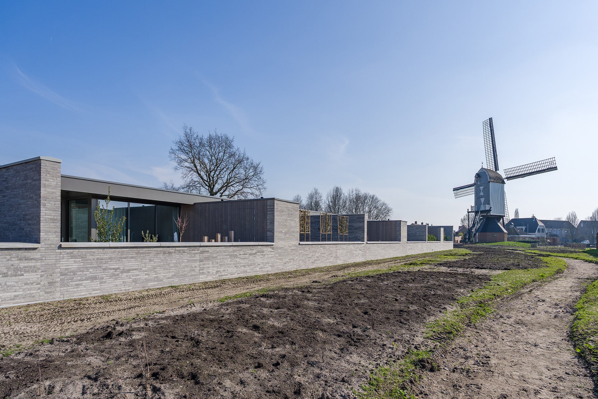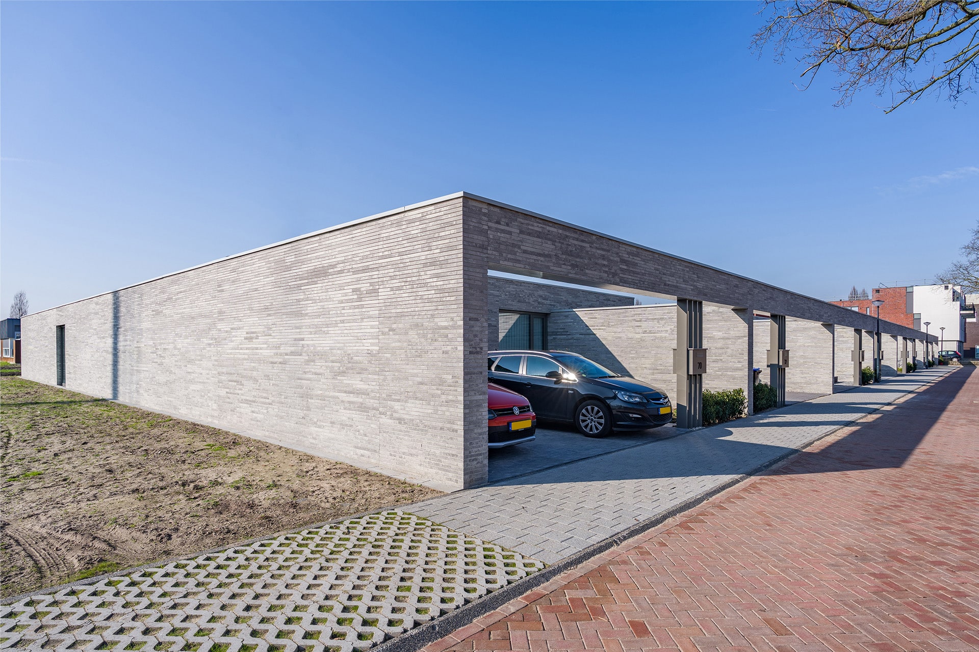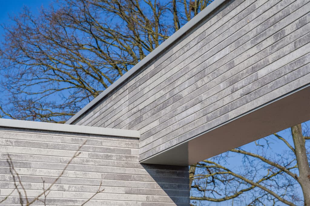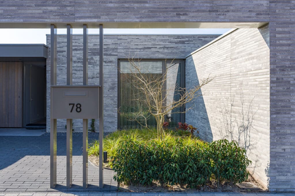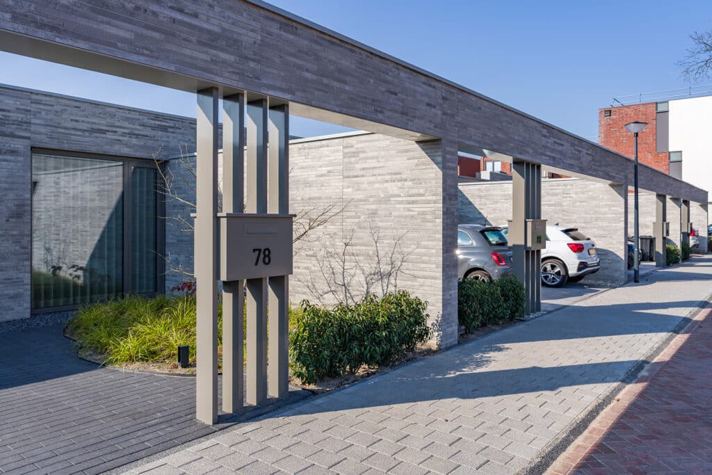 De acht identieke bungalows liggen aan elkaar geschakeld binnen één bouwmassa. In deze massa zijn diverse uitsneden gemaakt waardoor er verschillende buitenruimten ontstaan. Aan de voorzijde ontstaat zo een voortuin met ruimte voor o.a. twee auto’s. Centraal in het midden is een patio gesitueerd die diverse ruimten van daglicht voorzien. En aan de achterzijde ligt een achtertuin die over de volle breedte uitzicht geeft op het groen. Doormiddel van de gemetselde tuinmuren ontstaat er een duidelijke afbakening van de bebouwing en het omliggende groen. Deze alzijdigheid zorgt voor een heldere en strakke uitstraling waarbij dus alle gevels aandacht hebben gekregen. Er kan nu ook geen sprake zijn van een individuele eigenaar die een andere erfscheiding realiseert. Deze uniformiteit wordt versterkt door het gebruik van één langformaat gevelsteen waaruit zowel de gevels als de tuinmuren zijn uitgevoerd. De bewuste lichte kleurstelling zorgt niet alleen voor meer licht in het interieur, maar contrasteert ook mooi met het groen. De verticaal geplaatste houten gevelplanken geven de woning een extra warme uitstraling.