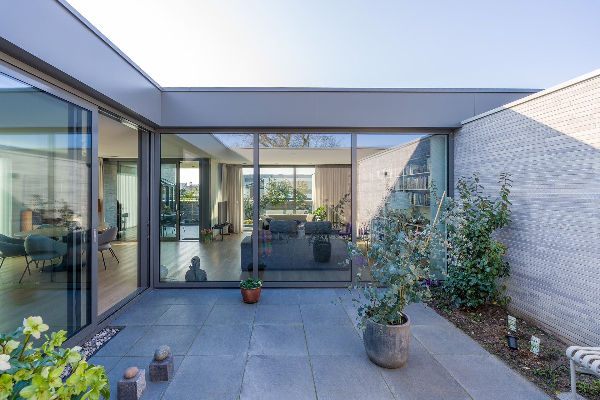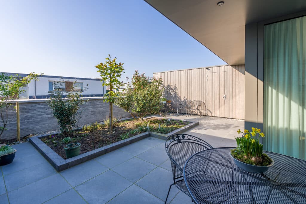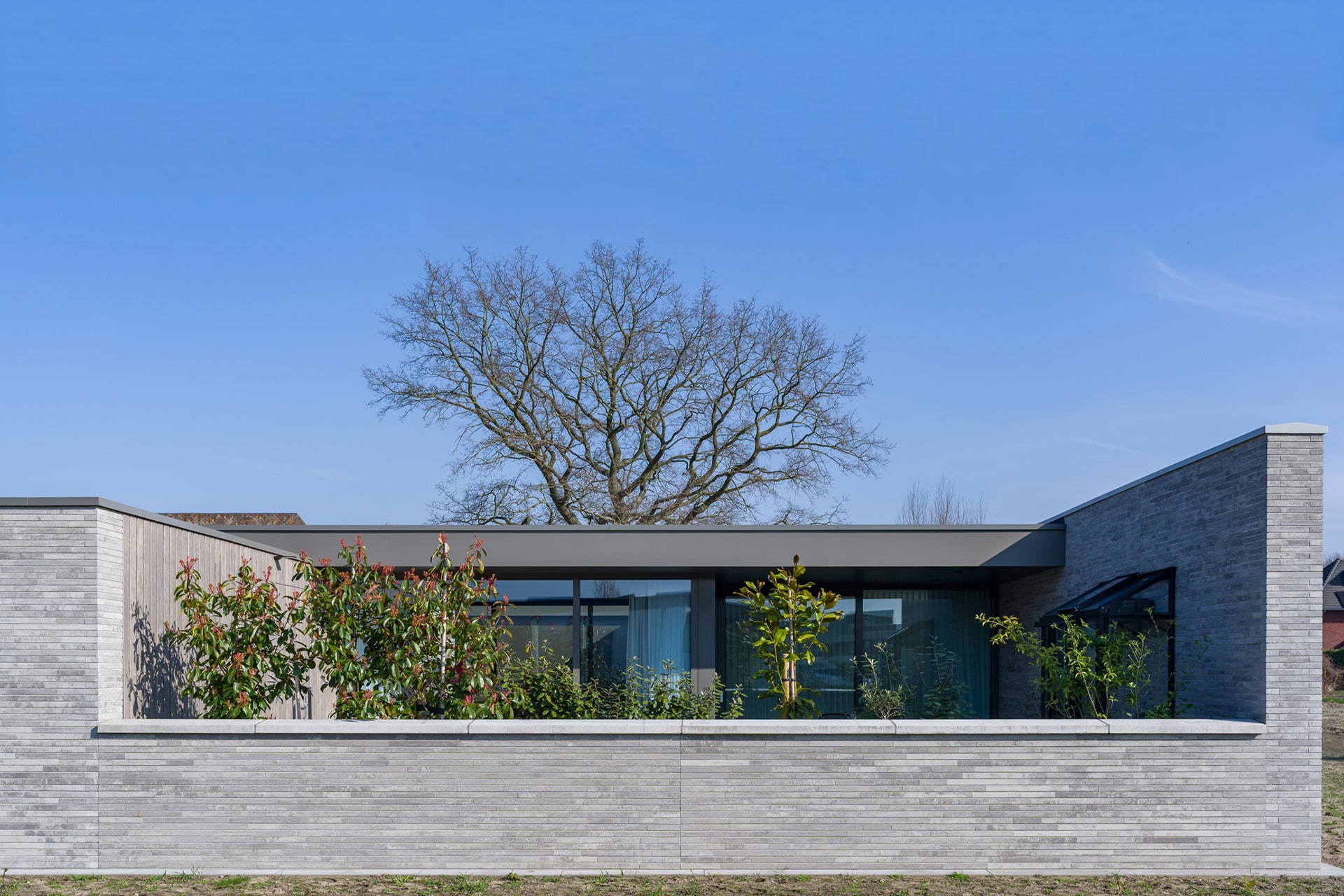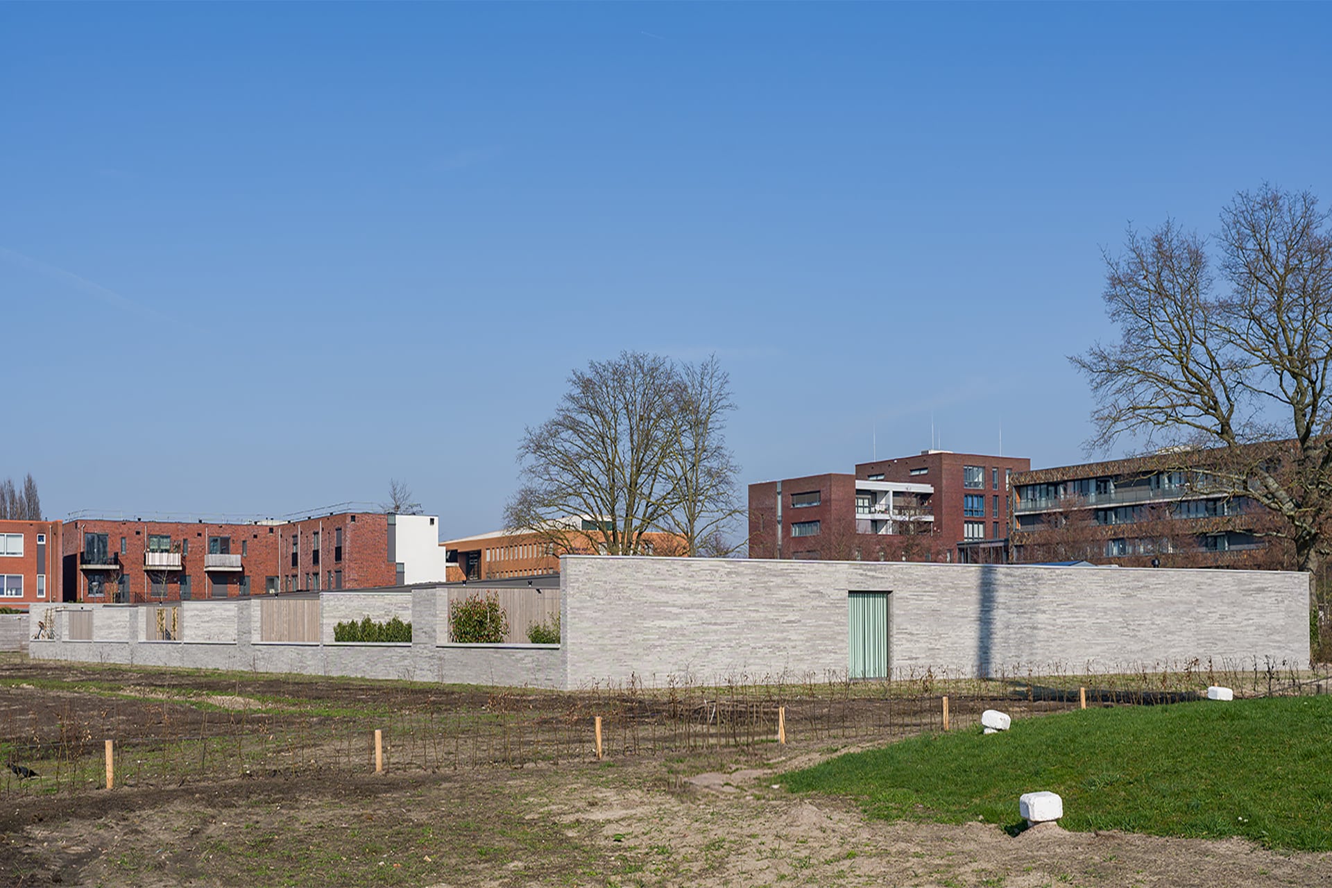 De acht identieke bungalows liggen aan elkaar geschakeld binnen één bouwmassa. In deze massa zijn diverse uitsneden gemaakt waardoor er verschillende buitenruimten ontstaan. Aan de voorzijde ontstaat zo een voortuin met ruimte voor o.a. twee auto’s. Centraal in het midden is een patio gesitueerd die diverse ruimten van daglicht voorzien. En aan de achterzijde ligt een achtertuin die over de volle breedte uitzicht geeft op het groen. Doormiddel van de gemetselde tuinmuren ontstaat er een duidelijke afbakening van de bebouwing en het omliggende groen. Deze alzijdigheid zorgt voor een heldere en strakke uitstraling waarbij dus alle gevels aandacht hebben gekregen. Er kan nu ook geen sprake zijn van een individuele eigenaar die een andere erfscheiding realiseert. Deze uniformiteit wordt versterkt door het gebruik van één langformaat gevelsteen waaruit zowel de gevels als de tuinmuren zijn uitgevoerd. De bewuste lichte kleurstelling zorgt niet alleen voor meer licht in het interieur, maar contrasteert ook mooi met het groen. De verticaal geplaatste houten gevelplanken geven de woning een extra warme uitstraling.