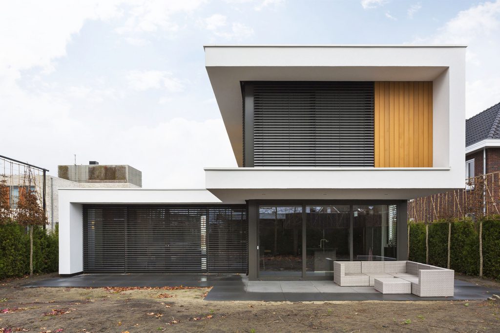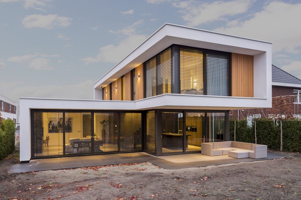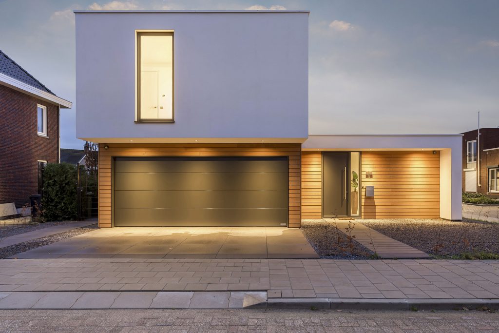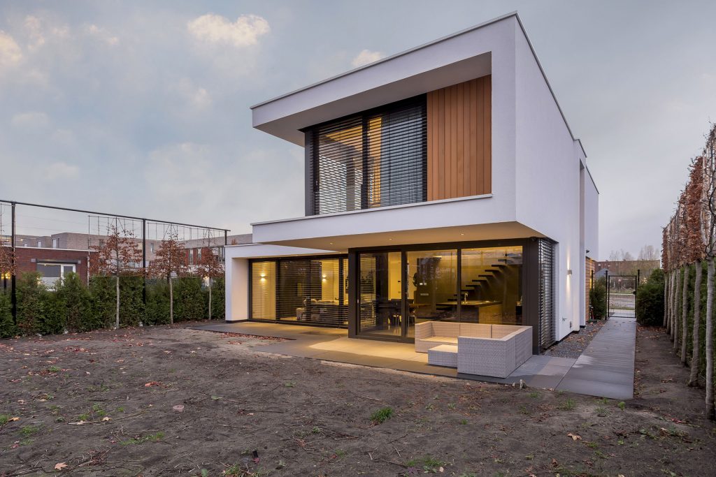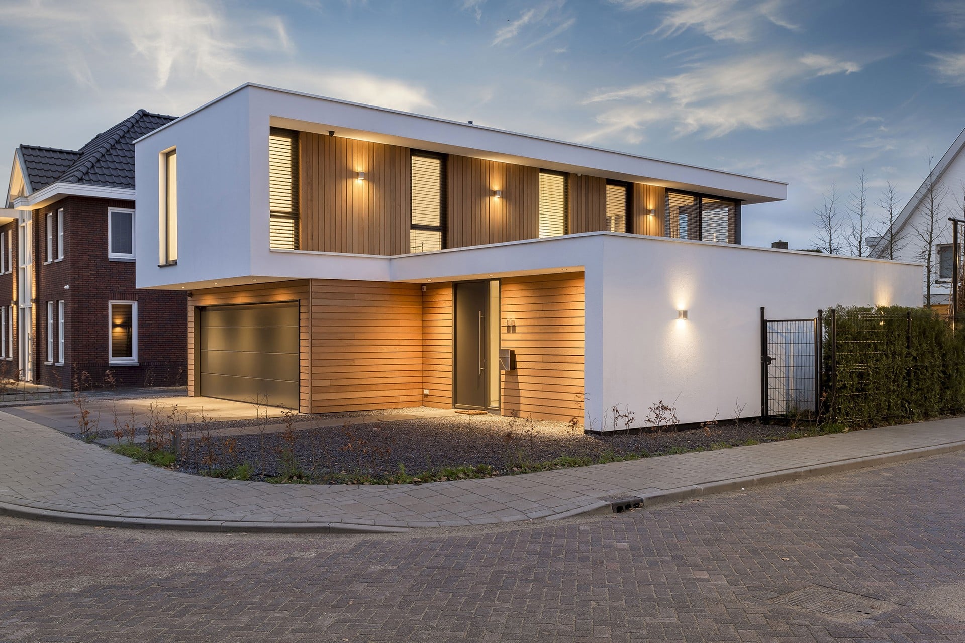 Deze woning is gelegen in een hoek in de wijk Landgoed Driessen te Sprang-Capelle. De woning is met de achtergevel volledig op het zuiden gericht. De verblijfsruimten zoals de keuken, woonkamer en slaapkamers zijn allen op het zuiden en westen gesitueerd. Doormiddel van grote glasvlakken, overstekken en buitenjaloezieƫn wordt maximaal gebruik gemaakt van de zon. Door passieve opwarming in de winter, maar koel in de zomer. De noord- en oostgevel zijn nagenoeg gesloten hier bevinden zich dan ook bewust geen verblijfsruimten. Aan de achterzijde is een uitkraging gerealiseerd van 3m waaronder zich een terras bevindt. De woning bevat tevens een dubbele garage en is voorzien van een ruime kelder. Het ontwerp laat zich kenmerken als een dynamisch vormgegeven wit gestukte massa met daartussen contrasterende warme vlakken van behandelde western red cederhouten gevelplanken. Het dynamische ontwerp zorgt er tevens voor dat de woning uit verschillende hoeken een ander voorkomen heeft. Doordat het een hoekwoning betreft komt dit goed tot uiting. Uiteraard is ook deze woning weer zeer energiezuinig. Luchtdicht, warmteterugwinning op ventilatie, hoogwaardige isolatie en het dak is volledig voorzien van PV-cellen.
