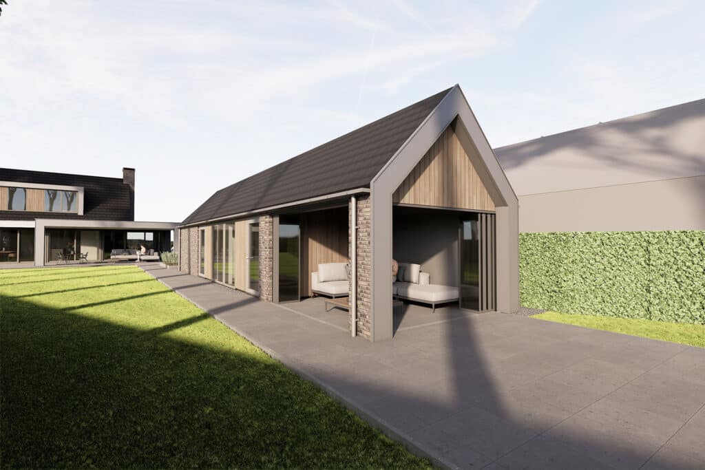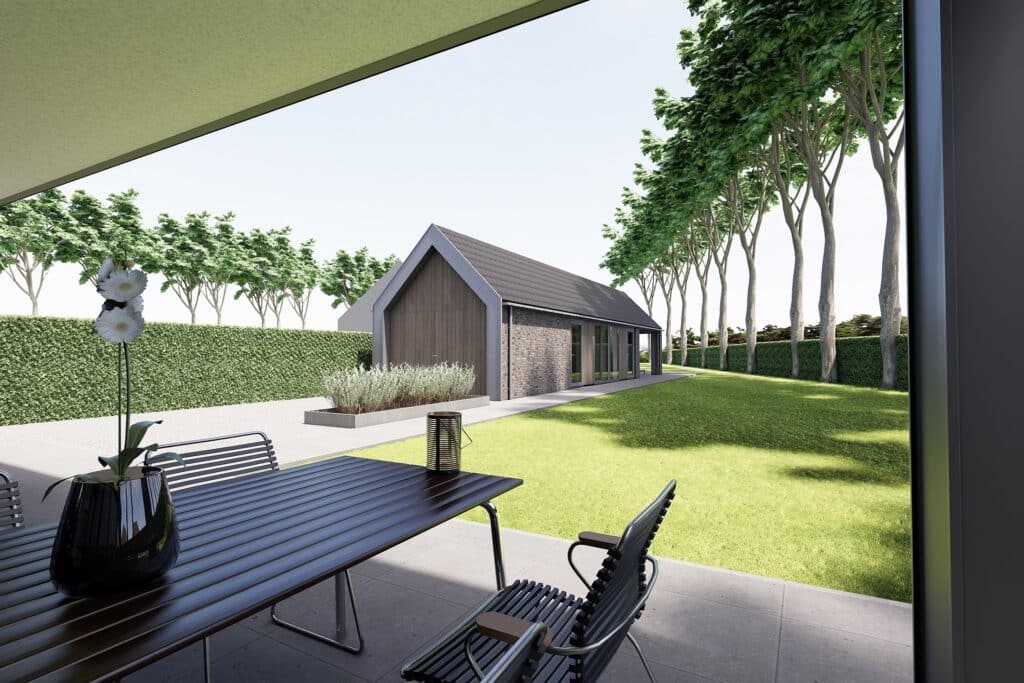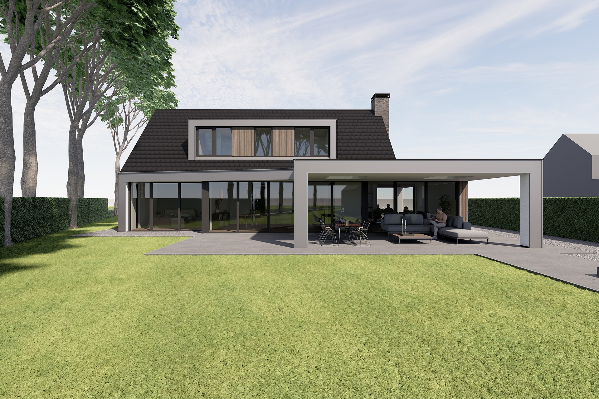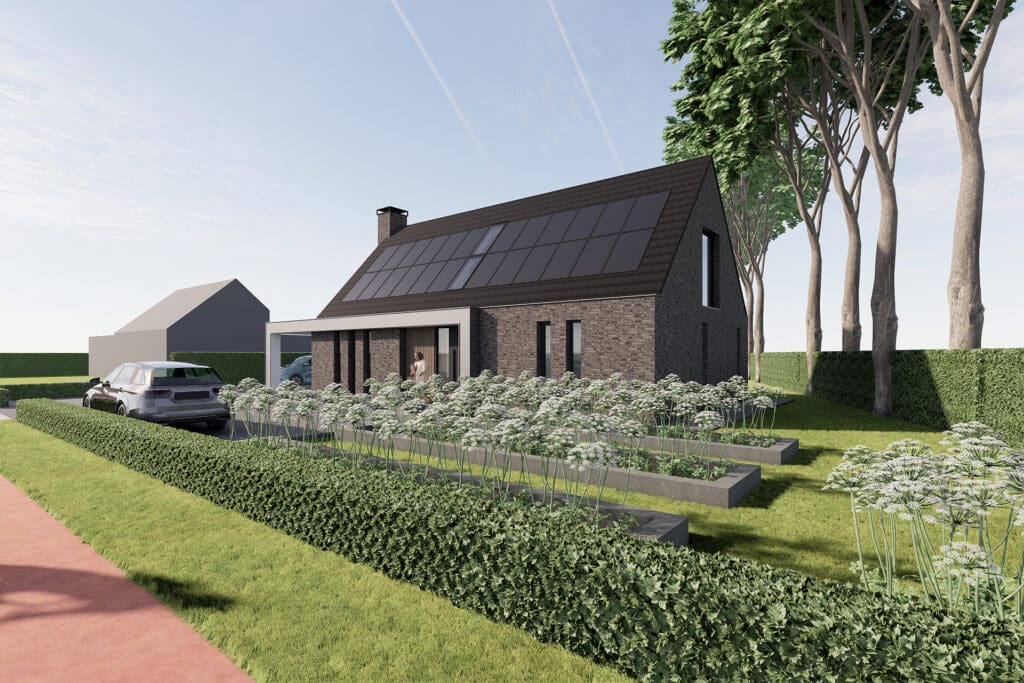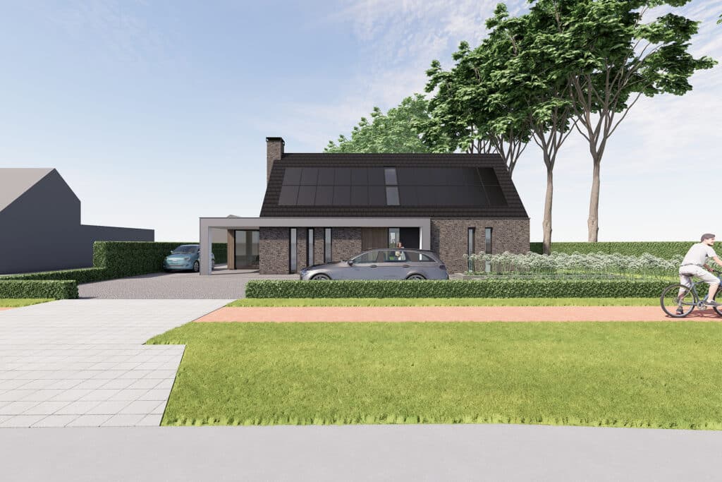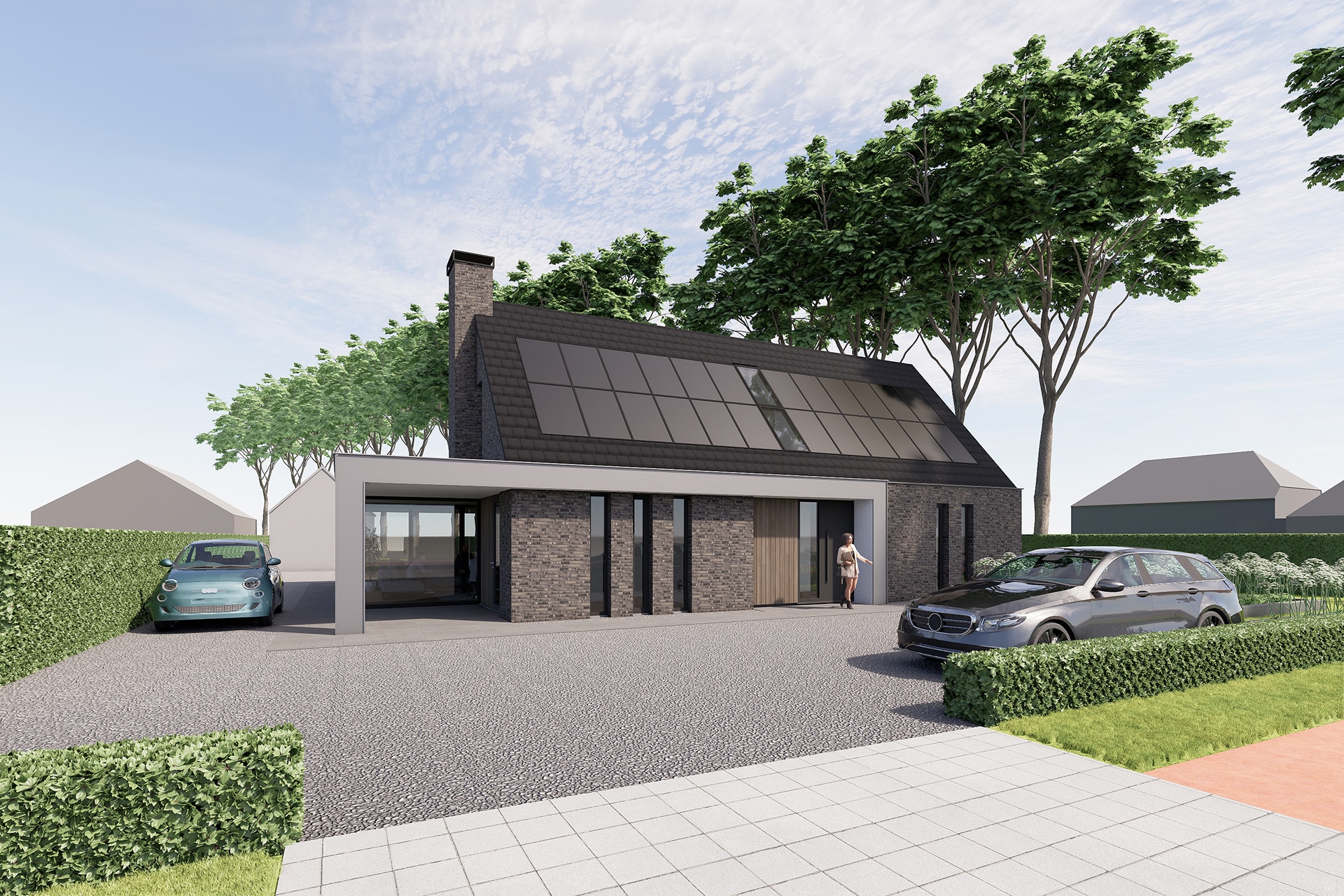 De woning ligt aan de rand van het dorp Heesch. De woningen in de omgeving kenmerken zich door een landelijke uitstraling met voornamelijk langskappen parallel aan de hoofdweg. Daar sluit het ontwerp van deze woning op eigentijdse wijze op aan. De dakgoten zijn subtiel weggewerkt middels verholen goten en zijn de zonnepanelen geïntegreerd in het dak. Door een combinatie van grijs metaal, bruine gevelsteen met Fraké gevelplanken ontstaat er een ingetogen en warme uitstraling.