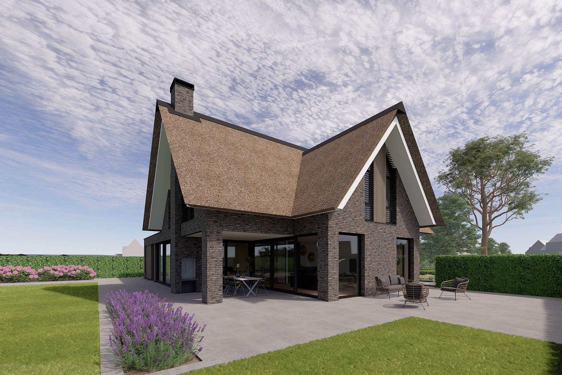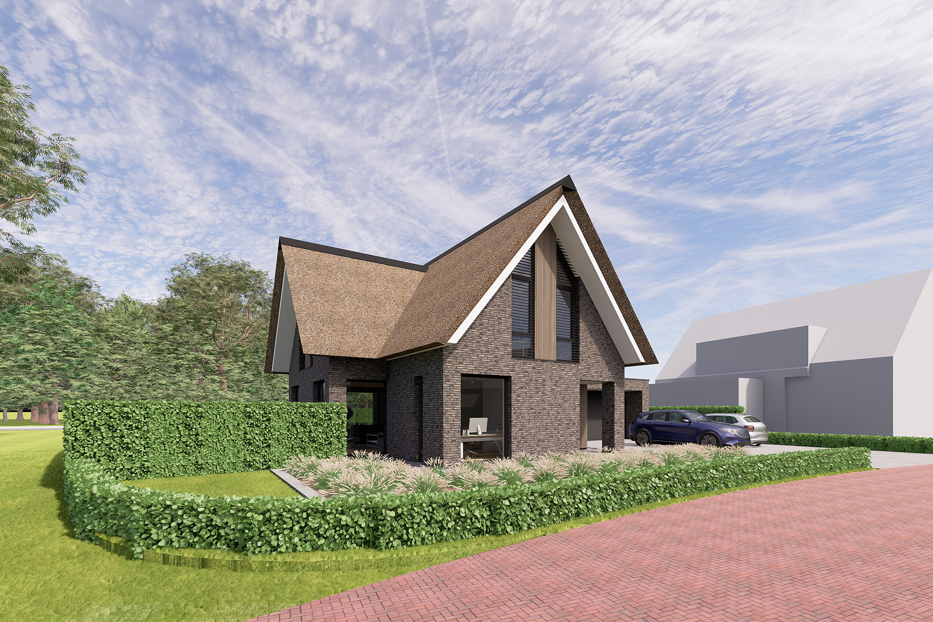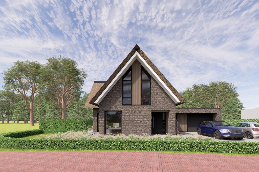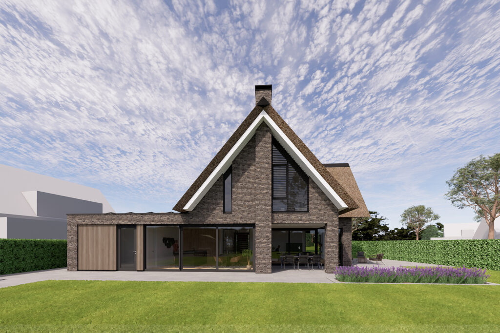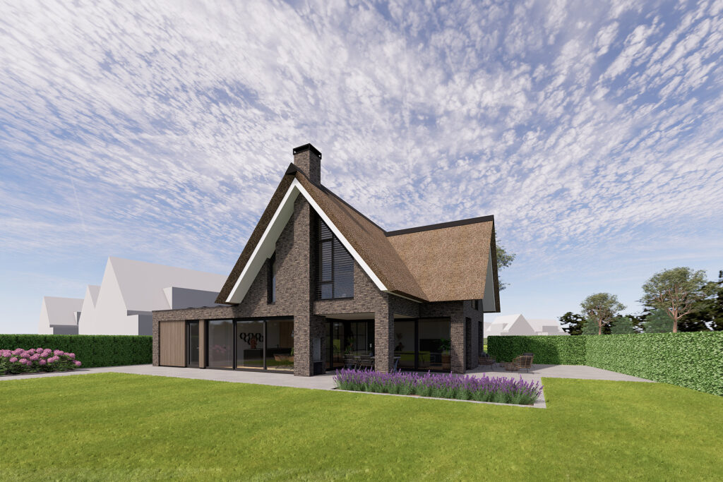 Deze moderne riet gedekte villa is gerealiseerd binnen het plan Landgoed Steenenburg in Nieuwkuijk. Dit is het gebied dat beter bekend staat als het voormalige ‘Land van Ooit’. Door de bijzondere ligging van het perceel is gekozen voor een samengestelde kap die naar beide richtingen is georiënteerd. Er is een fraai uitzicht op een brede groenstrook aan de achterzijde. In het ontwerp is hier rekening mee gehouden door de verblijfsruimten zoals de zitkamer, eetkeuken en de slaapkamer op de verdieping aan deze zijde te oriënteren.