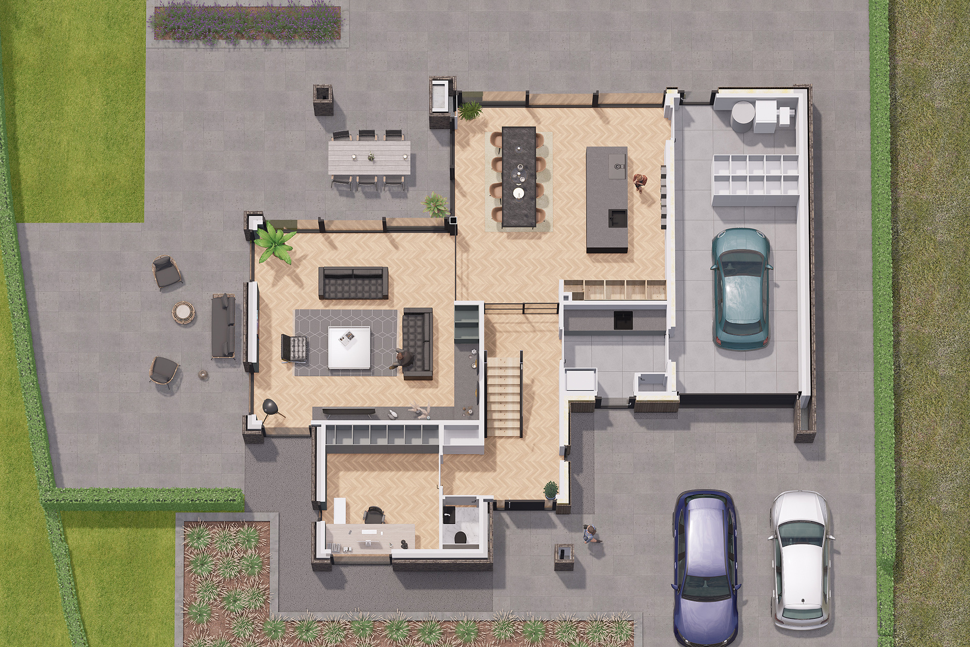 Door de bijzondere ligging van het perceel is gekozen voor een samengestelde kap die naar beide richtingen is georiënteerd.