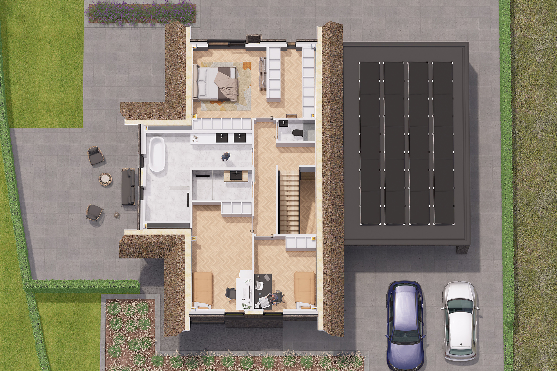 Door de bijzondere ligging van het perceel is gekozen voor een samengestelde kap die naar beide richtingen is georiënteerd.