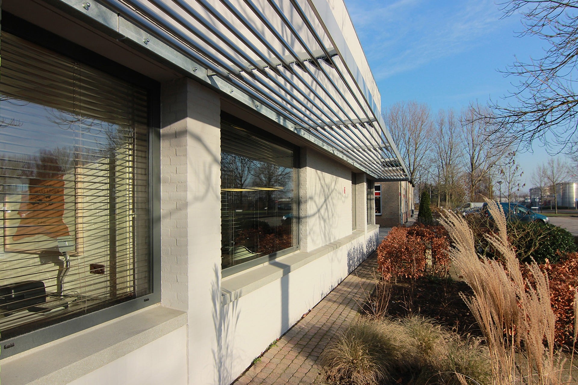 Het bestaande pand bevat een duidelijk horizontale lijn die extra is aangezet door de aluminium luifel