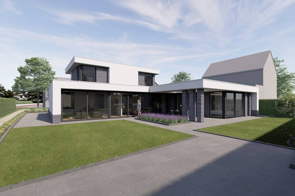 De villa is een dynamische combinatie tussen wit stukwerk en gevelmetselwerk bestaande uit lange betonstenen. De gevelsteen vormt de basis van het ontwerp en loopt aan de voorzijde over in een bloembak. Deze verbindt de aanbouw met de hoofdmassa. Hierdoor ontstaat een fraaie oplossing richting de hoek van het perceel. De wit gestukte massa vormt de bovenverdieping en creëert een overstek bij de voordeur en loopt over in een overstek bij de garage en naar de overkapping aan de achterzijde. Hierdoor vormt de hoofdmassa zich samen met de aanbouwen tot één geheel.