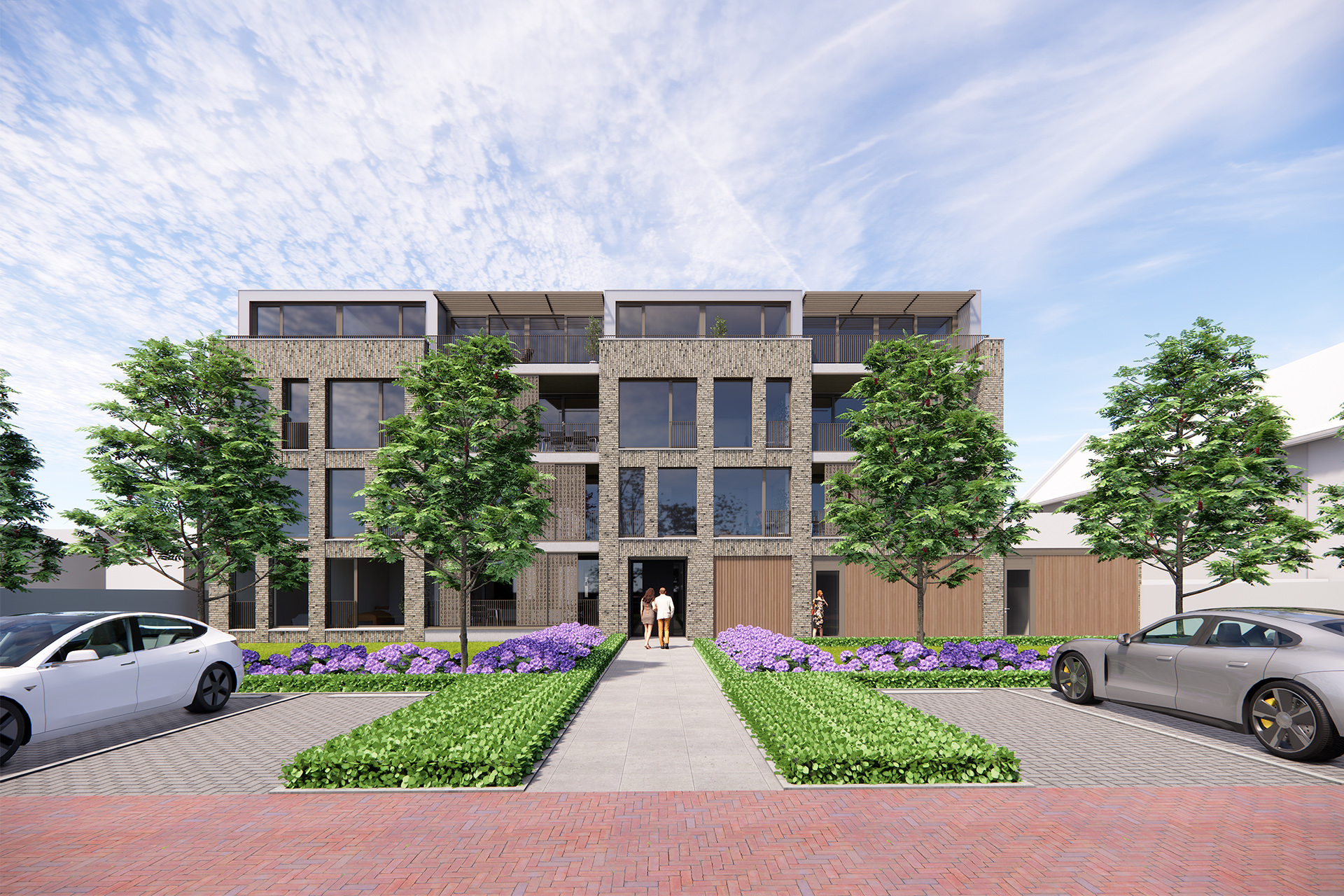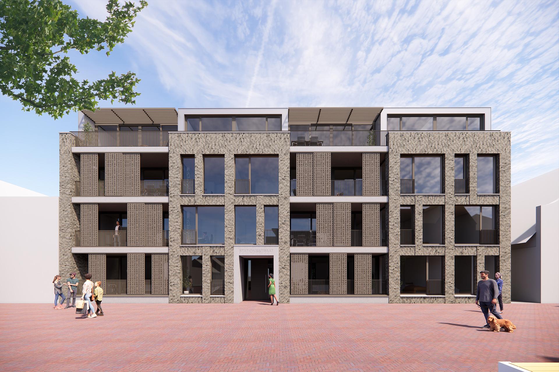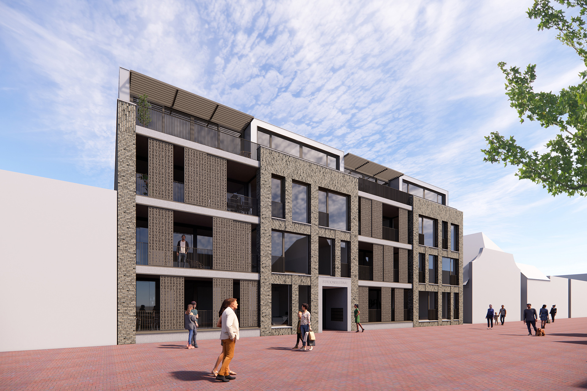 Een gebouw met ook een bijzondere uitstraling. Ter plaatse van de woonkamer zijn over de volle breedte balkons opgenomen. Door de balkons te voorzien van decoratieve schermen met uitgestanste letters waarvan de teksten in samenwerking met een kunstenaar tot stand zullen komen. De schermen zijn naar behoefte te verplaatsen en zorgen voor zonwering en/of privacy. Dit zorgt voor een dynamisch en wisselend gevelbeeld. Ter plaatse van de slaapkamers is de gevel iets meer gesloten en voorzien van versprongen verticaal en horizontaal geplaatste metselwerk banden. Deze zorgen voor een plastiek en levendige gevel. Doordat de gevel vooral ook vanaf de zijkant wordt gekeken door het langslopende publiek verandert het aangezicht constant. De bovenste verdieping is terugliggend uitgevoerd in een licht metaal. Deze gaat mooi over in de lucht en komt zo minder zwaar over. Horizontale aluminiumlamellen zorgen voor de benodigde zonwering en voorkomt de plaatsing van minder fraaie parasols.