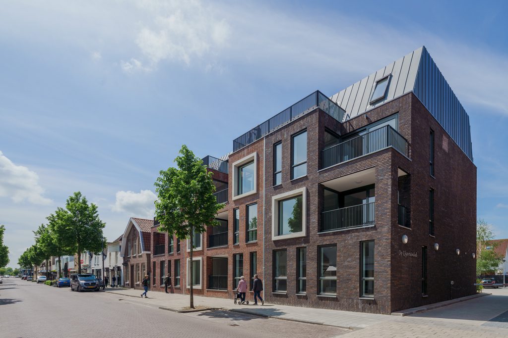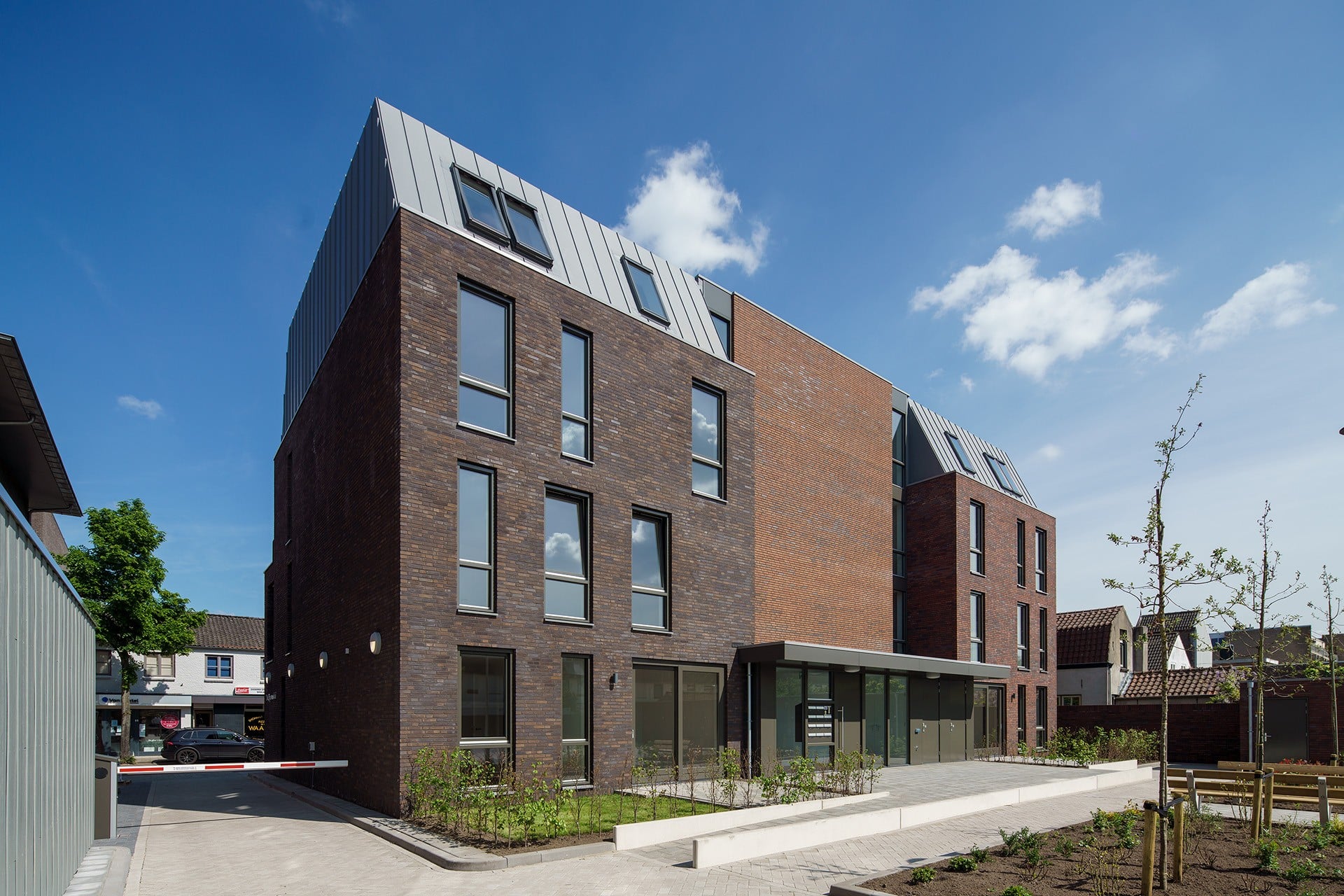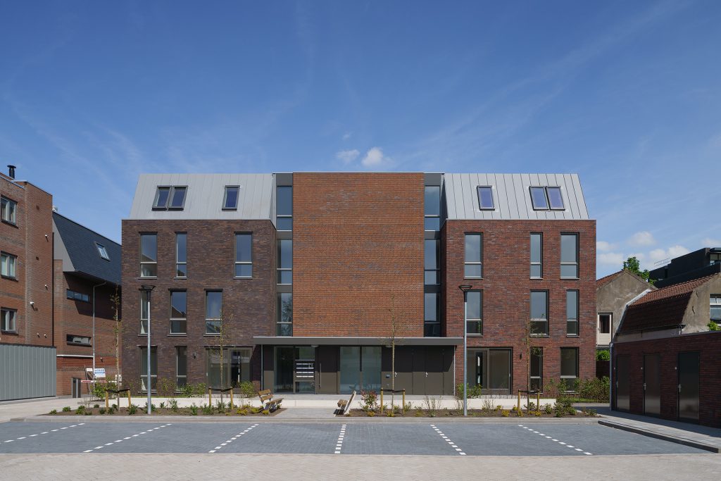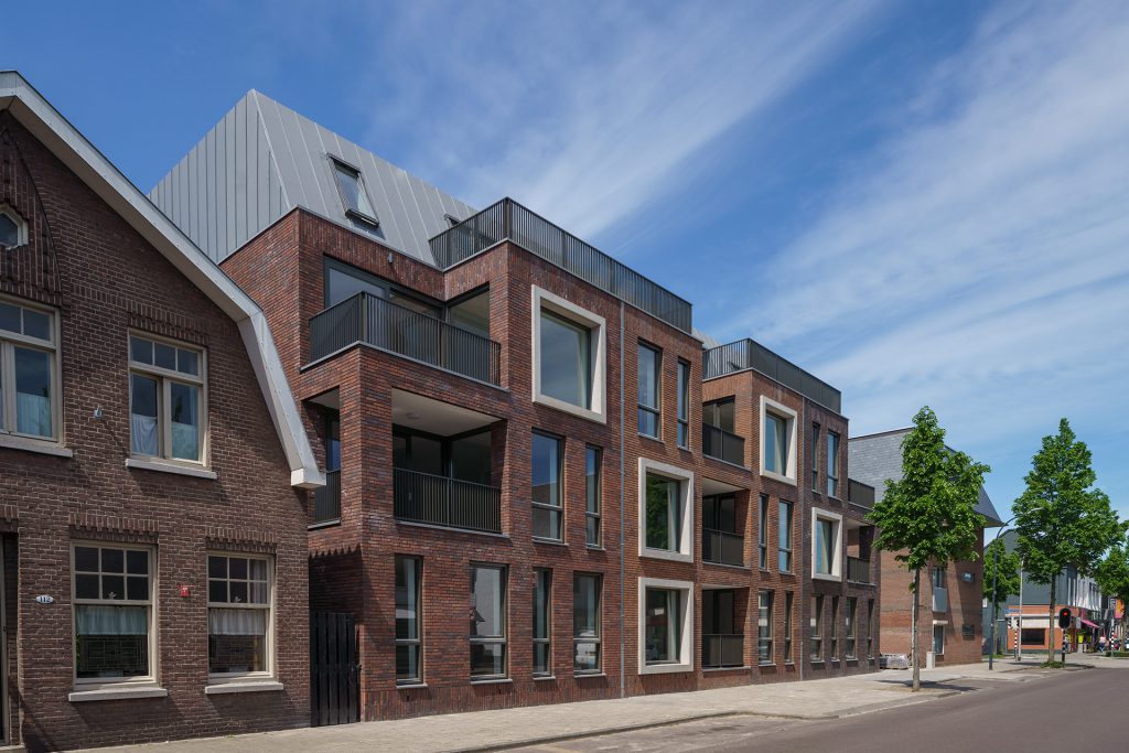 Het speelse gevelbeeld van diepliggende loggia's, inspringende dakterrassen en uitstekende kaders zorgt voor een vriendelijk inpassing in het bestaande straatbeeld.