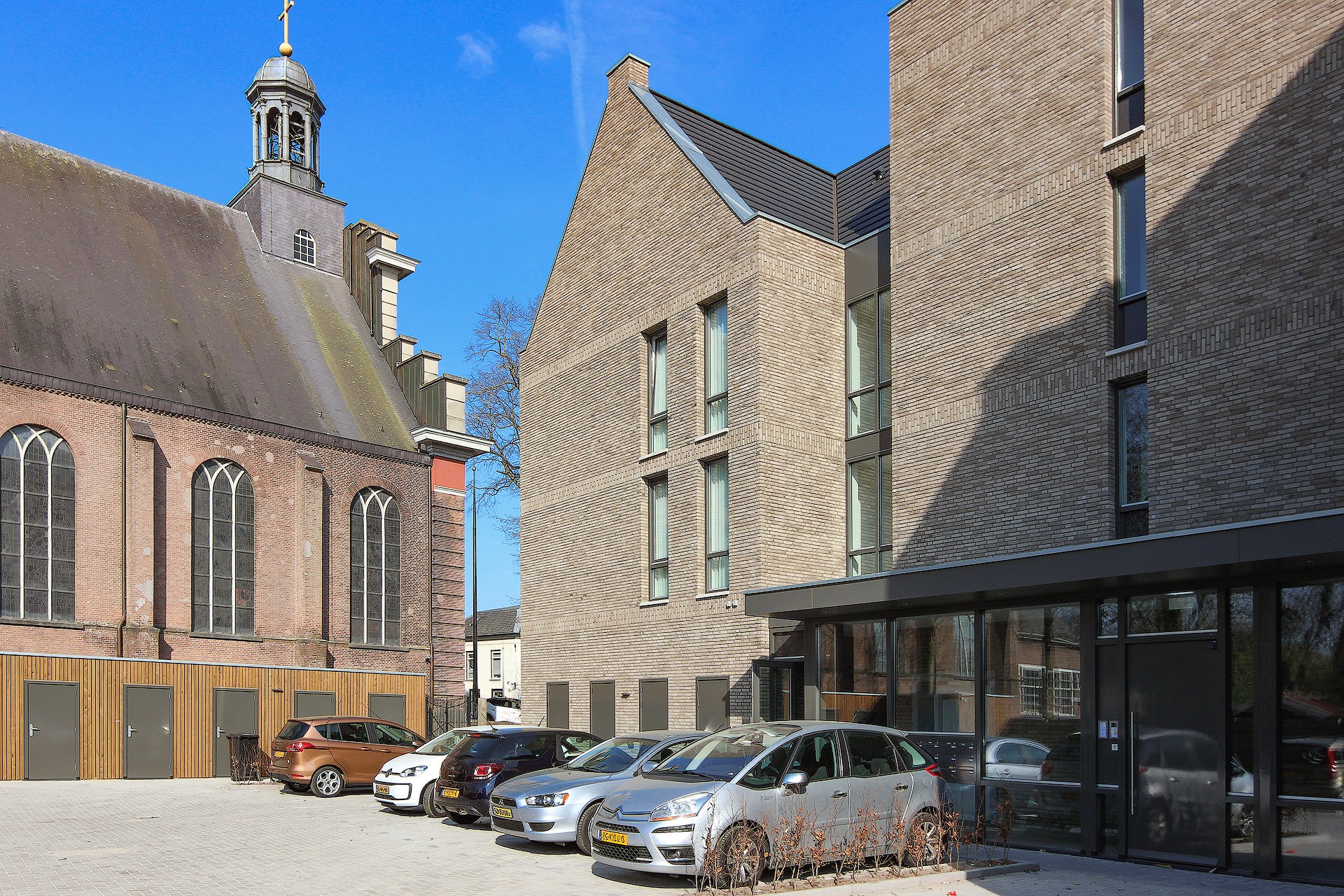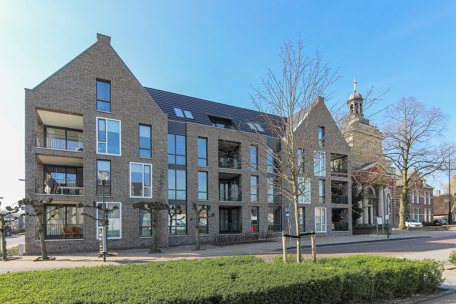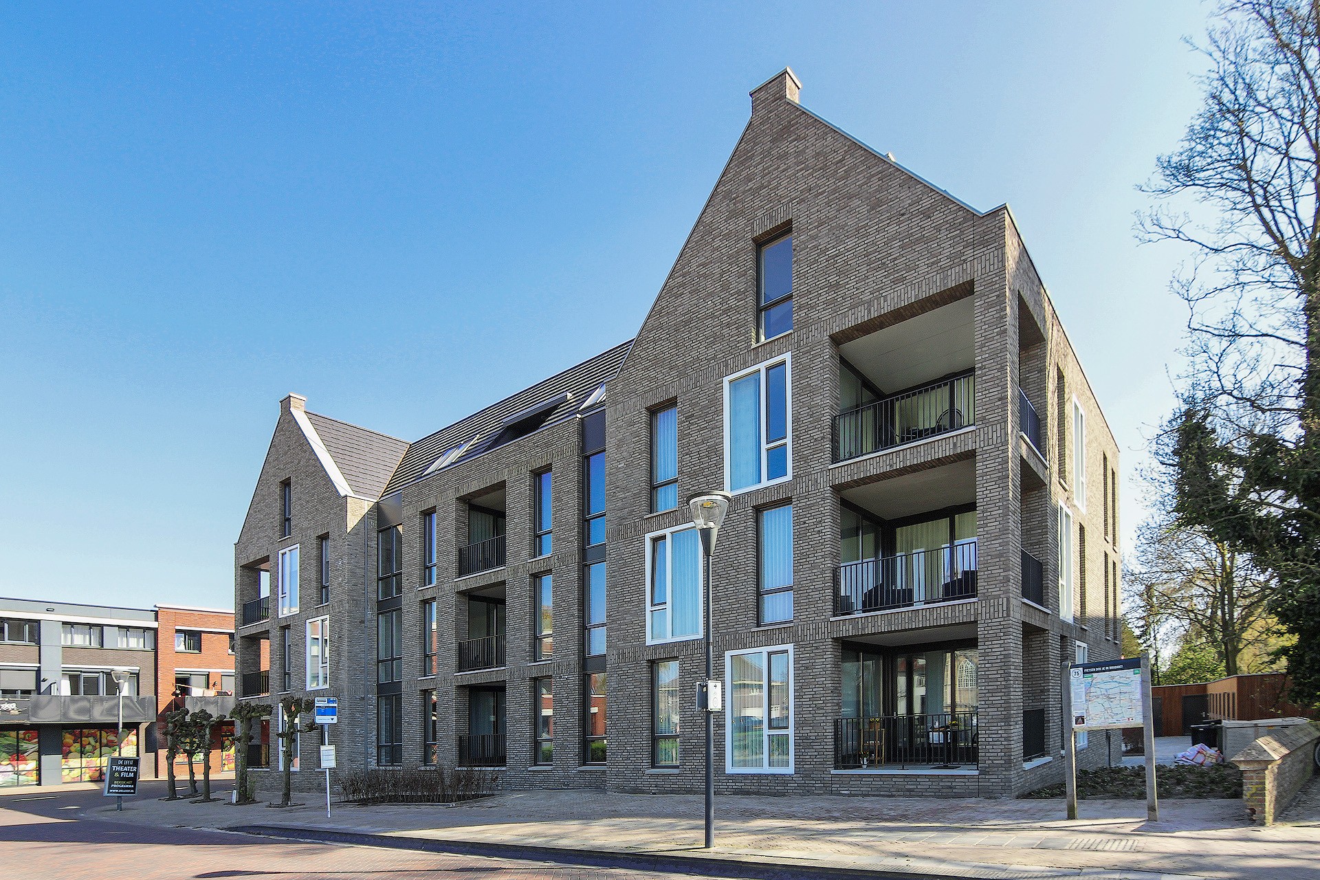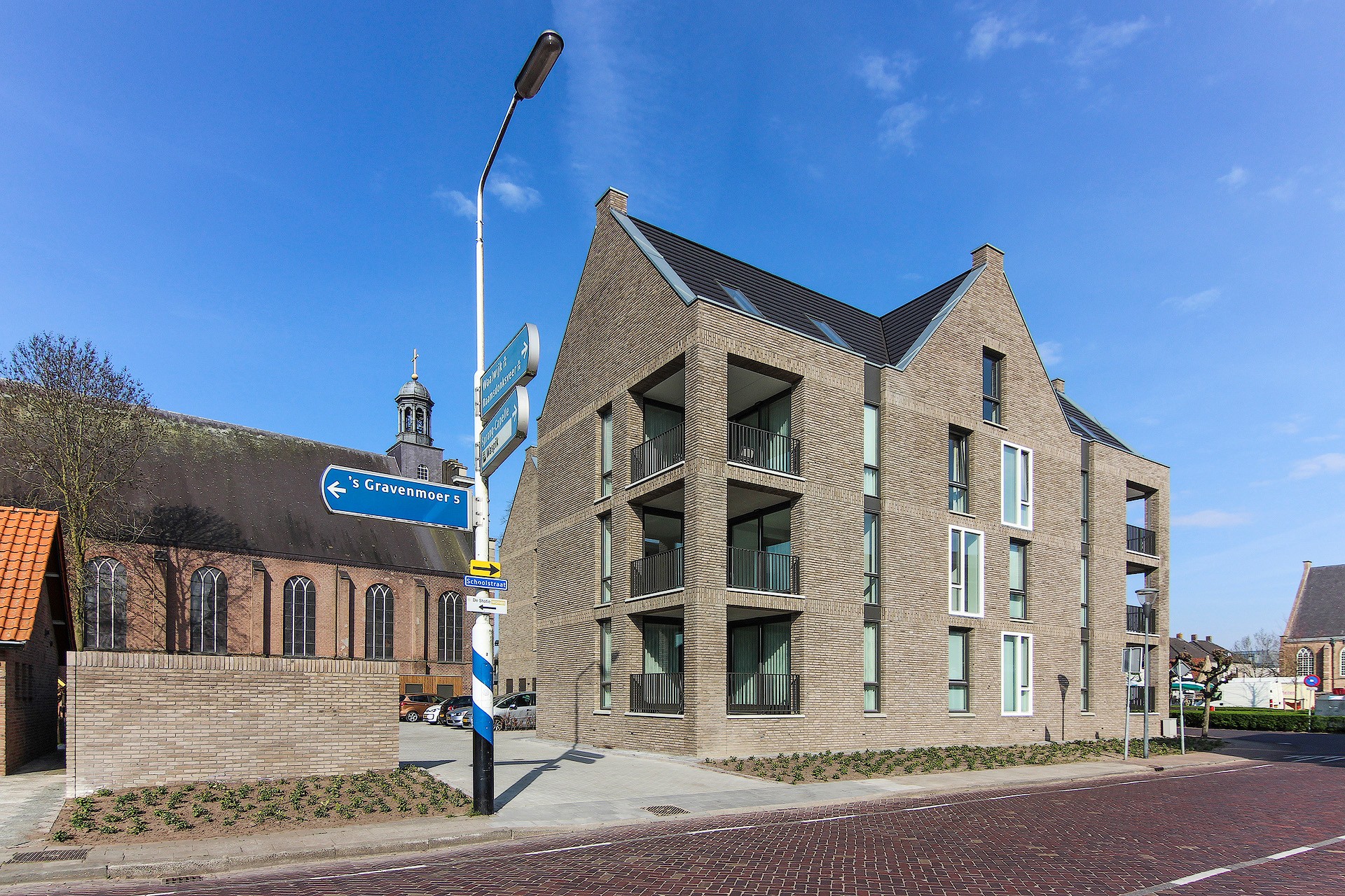 Op de hoek van de Schoolstraat en het Dorpsplein in het centrum van Waspik hebben wij een plan gemaakt voor een 15-tal appartementen. Uitgangspunt was een logische inpassing tussen de naast gelegen kerk en het woonblok met supermarkt aan de oostzijde. Het gebouw wordt als een zelfstandig, statig gebouw ervaren in overeenstemming met de aanwezige gebouwen rond het plein. Het dient een eigen karakteristiek te hebben waarbij herkenbaarheid belangrijk is. Door het gebouw te geleden in zowel verticale als horizontale richting dient de schaal leesbaar te blijven en aan te sluiten bij de omgeving. De kozijnen met zowel diepe als geen negge en de diep liggende loggia’s ontstaat er een interessante gevel met veel plastiek. De kap beëindigd deze massa net als omliggende gebouwen en vormt zo een fraaie overgang van de met name de kerk naar het wooncomplex aan de oostzijde.